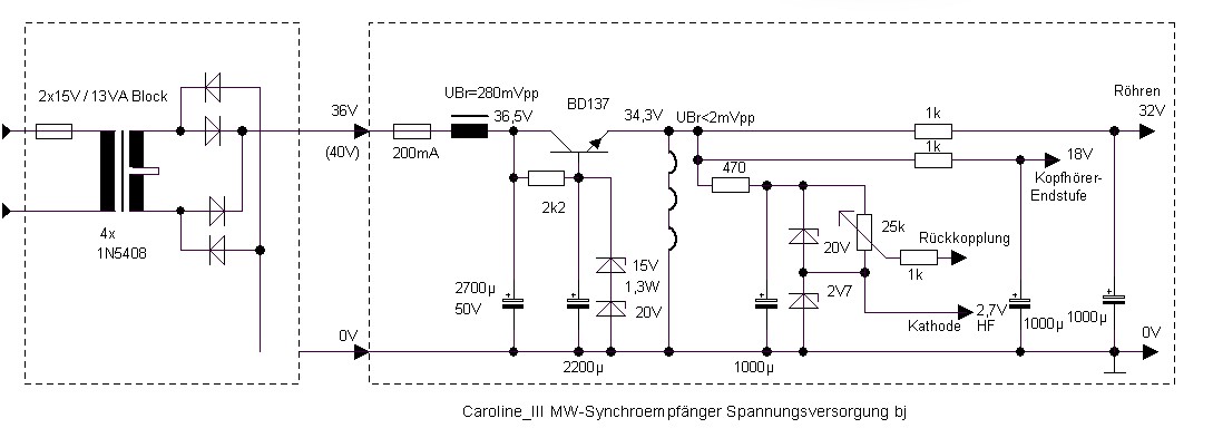 Wie in der guten alten Zeit Längsgeregelt, ein einziger Transistor besorgt Siebung, sanftes Hochfahren der Heizspannung ("Heißleiter-Ersatz") und Stabilisierung aller Spannungen ab 36Volt Versorgungsspannung.
