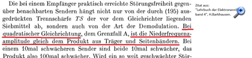 Zitieren:[Der Klirrfaktor] ist unabhängig von der Trägeramplitude und nur dem Modulationsgrad proportional. Nach diesem Ergebnis dürfte die Hochfrequenz höchstens mit 20% durchmoduliert werden, wenn k' unter 5% bleiben soll. Zum Glück tritt dieser hohe Klirrfaktor nur bei der Demodulation an parabelförmigen Kennlinien auf. (Schröder: "Elektrische Nachrichtentechnik", 1966)