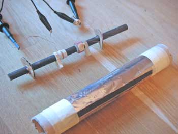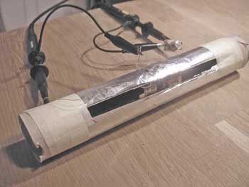 Eine denkbare Abhilfe wäre es dann einen Rohrdurchmesser zu wählen, der viel größer als der Durchmesser des Ferritstabes wäre. In der Praxis kann man das dann mit einer oder zwei Papprollen einer Klopapierrolle ausprobieren, die man mit Alu beklebt. Wenn man die Papprolle mit Klopapier ausstopft, kann man auf diese Weise den Ferritstab mittig fixieren. Heißkleber hält dann alles zusammen. In einem normalen Haushalt ist also fast alles vorhanden, was man braucht. Ob meine Vermutung mit dem Durchmesser richtig ist, kann ich aber nicht mit Bestimmtheit sagen.