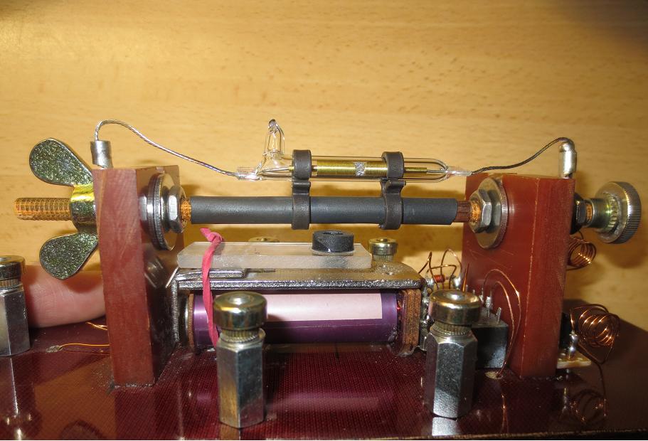 es freut mich zu hören, dass mein Tip mit dem Kohärer aus den Staaten auch bei Dir gut ankam. Das mit dem Zoll ist immer nervig. Da nutzt es auch nichts, wenn der Zettel außen drauf ist, auspacken und vorzeigen musst Du immer. Ich ehe immer gleich früh um 7 Uhr zum Zoll, da brauchte ich noch nie warten. Dave hatte mir auch ein Realis mitgeschickt und ich habe auch nur 1,5 V im Stromkreis. Mein Kohärer ist auch einem einseitig befestigten Holzbrettchen befestigt ud schwingt am anderen Ende frei. Darunter eine Klingel zum Klopfen (Löschen). Das ist die alte Lösung von Marconi und Popov. Du hast den Kohärer auf einem Rundstab- diese Lösung habe ich auch schon auf alten Fotos gesehen. Wozu dient die Rändelschraube rechts? Kannst Du damit eine Empfindlichkeit einstellen?
