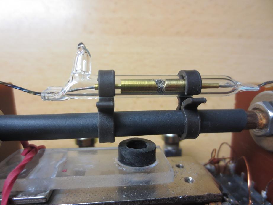 Ein Eigenbau ist nicht schlecht. Hier läßt sich bestimmt noch ein besseres Löschverhalten heraus- holen. Die Elektroden sollten etwas feiner werden und zweiseitig angeschrägt sein. Ein Nachteil des Eigenbaus ist, dass man das Röhrchen nicht luftleer bekommt. Hier kann der große Vorteil liegen,...denn die Replik hat ein Vakuum. Am wichtigsten ist das Relais. Es sollte eine möglichst kleine Strom- aufnahme und Ansprechspannung haben. Hier im gezeigten Aufbau 12mA ! Also 36mW ! Ein Test mit 1.5 V war leider negativ. Ich denke, 2,5V braucht das Relais als Minimum.