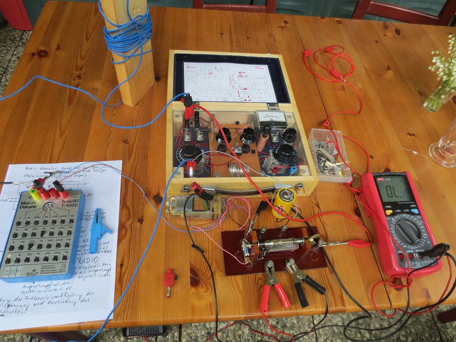Ich hatte übrigens im stillen Kämmerlein die Idee, meine jetzige Diodenbeschaltung später mal durch Bose- Elemente zu ersetzen. 5mm Kohleelektrode / Tropfen Qecksilber und Stahlelektrode, verklebt in einem Glasröhrchen. Eigentlich ein Kohärer mit später entdecktem Gleichrichtereffekt ohne Beklopfung.