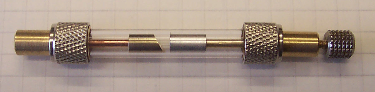 hier mal das Bild von meinem Fritter , gebaut aus einem Stück Glasrohr von einer Laserdruckerheizröhre, etwas Bronze, paar Fahradteile und einer Rändelmutter. Der Feststehende abgeschrgte Kontakt soll noch versilbert werden , der Verstellbare war ein versiberter Kontakt von dem lieben Bertold (foxgolf) aus der ......kiste .