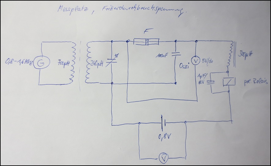 Ich hatte mich ja schon einmal mit einem Messaufbau für die Fritterei auseinandergesetzt. Heute musste ich nochmal diesen Test wiederholen, da sich ja die Randbedingungen mit dem polarisierten Relais verändert haben. Hier mal zwei Bilder zum Testaufbau und im Anschluss die Beschreibung zur Messung. Der Plan beinhaltet nur die wesentlichen Komponenten. Es geht um die Durchbruchspannung und deren Messung am Frequenzgenerator und Oszi.