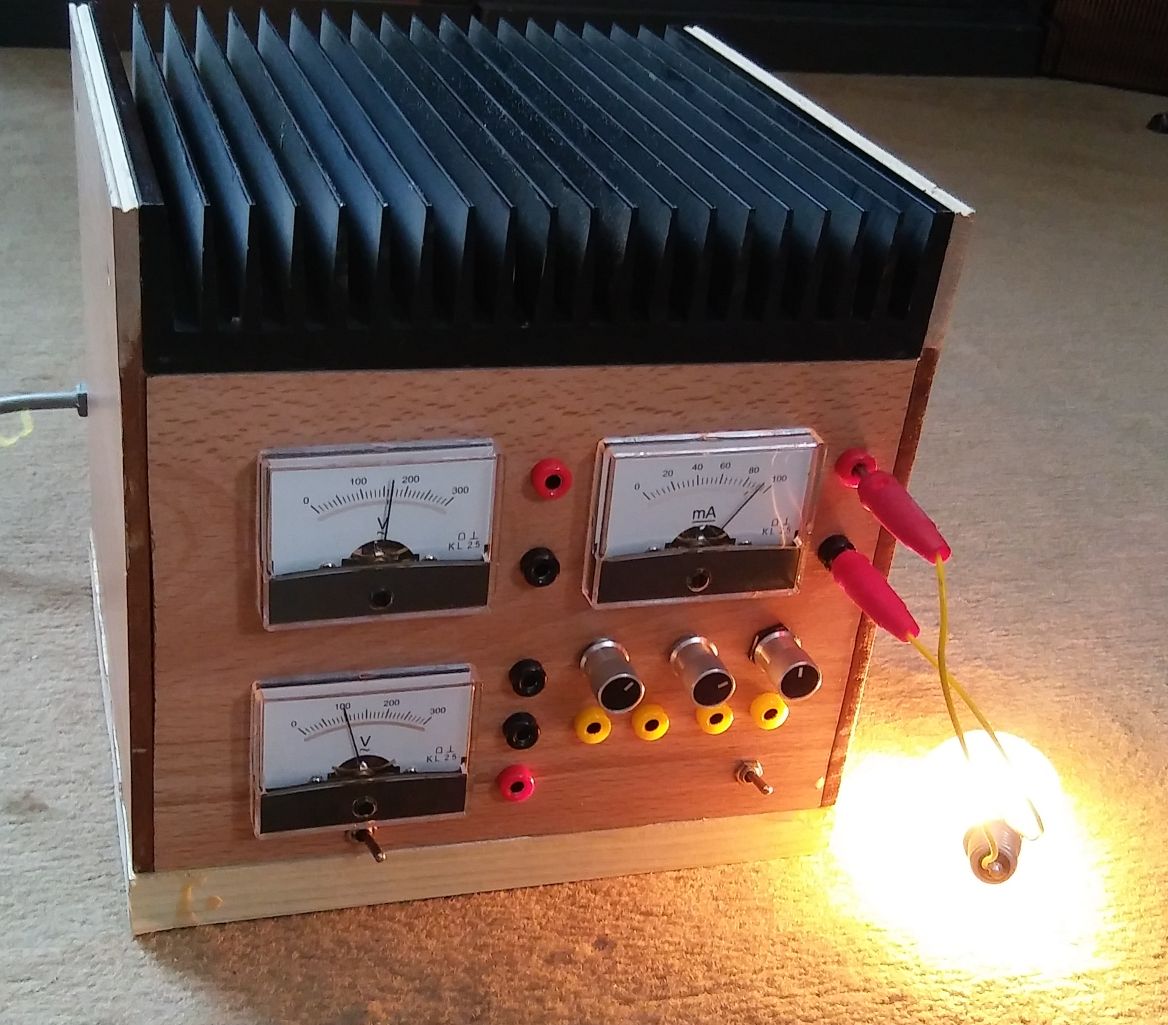 Die Instrumente chinesischer Herkunft können für knapp 5 Euro pro Stück besorgt werden. Das Gehäuse ist aus Laminat-Verschnitt hergestellt. Für die Strombegrenzung empfehle ich einen BD135...139 und nicht den BC639. Ich möchte klarstellen, dass mir ein Heathkit IP-17 auch lieber gewesen wäre. Wegen Nichtverfügbarkeit muss es aber auch so gehen.