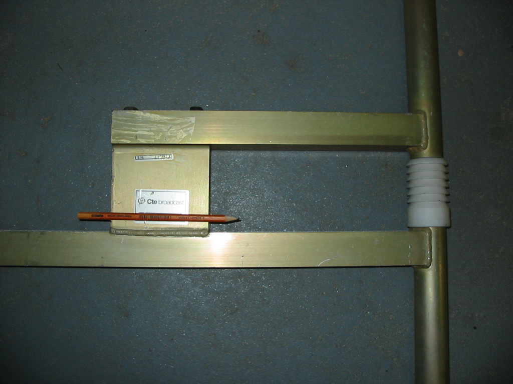 weil hier auf das SWR so viel Wert gelegt wird, hier mal ein Foto einer 2kW Senderantenne - ups - als gestreckter Dipol. Rundmaterial und Vierkant haben 36mm Aussenmass. Bei diesem Strahlerdurchmesser ist Bandbreite machbar: Der Hersteller gibt ein VSWR < 1:1,4 im ganzen Band 87,5 bis 108 MHz an. Mit 250 Euro ist die Antenne auch noch bezahlbar. Leider lassen sich die seitlichen Verschraubungen nicht lösen, um den Führung des Mittelleiters zu verfolgen. Der Hersteller hat dort wohl verklebt oder sogar mit Vergussmasse gearbeitet.