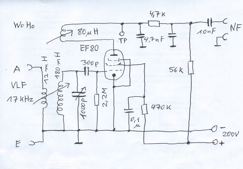 Heute Morgen habe ich mal auf die Schnelle ein VLF-Audion mit der EF80 zusammengebastelt, mit dem Ziel, die erzielbare Bandbreite zu messen. Dafür gebrauche ich einen Spectrum-Analyzer (Tek 5L4N). Die untenstehende Schaltung zeigt also ein normales Audion mit Rückkopplung, wobei die so eingestellt wird, dass gerade noch KEINE Selbsterregung eintritt.