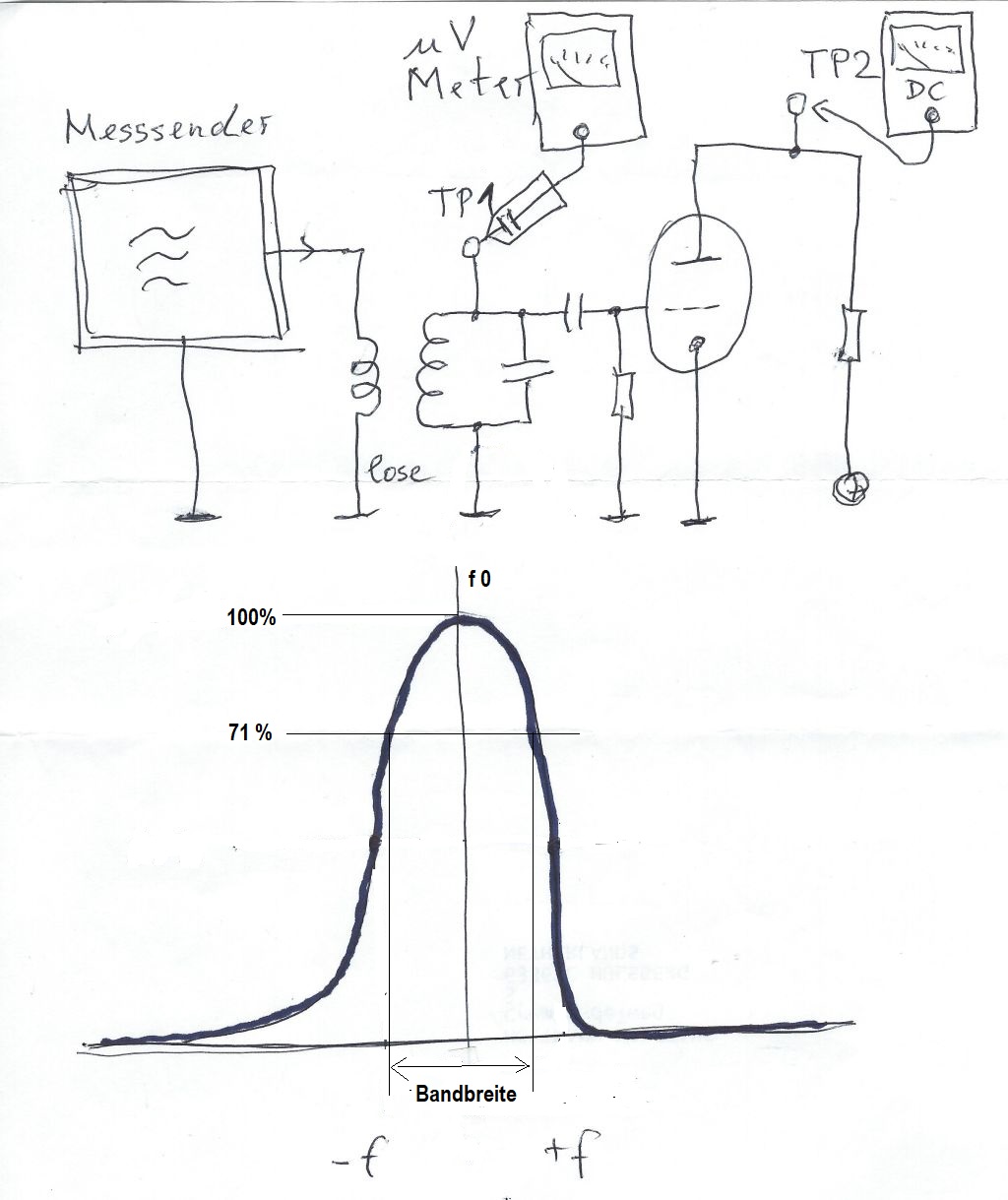 Auf Kästchenpapier reproduziert man eine glockenförmige Durchlasskurve, wo die Spannungswerte in Bezug auf die eingespeiste Frequenz zu sehen sind. Die Definition der Bandbreite ist gegeben, wo auf beiden Seiten die Spannung auf 71% sinkt. Dazwischen kann man die gemessene Bandbreite ermitteln. Ohne eingespeistes HF-Signal ist die Ruhespannung an der Anode als 0% zu betrachten.
