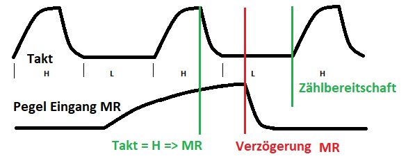 Mir kam nun die Idee, den "unsicheren" Takt ganz zu verschenken und über Verknüpfung dafür zu sorgen, dass erst dann ein Signal auf MR gegeben wird, wenn der Takt wieder auf H geht, denn bei der ansteigenden Flanke bleibt der Zustand der Ausgänge noch stabil.