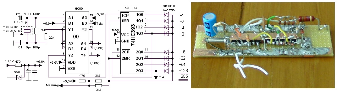 Die Zählung wurde einmal mit dem Teiler 255 durchgeführt und zur Kontrolle mit dem Teiler 256 (MR auf Masse gelegt). Es könnte daher gut sein, dass die Schaltung sogar bis 12 MHz mit dem HC4040 verwendbar ist.