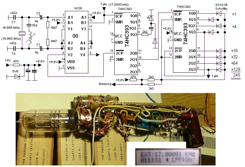 Passend mit der neuen Schaltung war u.a. der 16,655 MHz-Quarz. Aus dem Testaufbau ist mit einem zusätzlichen 74HC393 ein SAQ-Überlagerer für 200 Hz Hörton geworden, 17,0000 kHz Frequenz erfordern den Teilungs-Faktor 980, es wird erst durch 4 geteilt, so dass die Diodenlogik "nur" 4,xxx MHz machen muß. Danach nochmal durch 245: