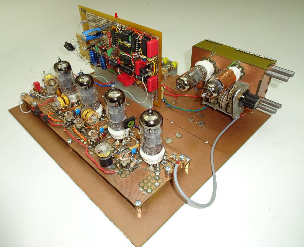 Den aktuellen Zustand des Radios zeigen die folgenden Bilder. Zu den schon vorhandenen Baugruppen, in Röhrentechnik, ist ein Stereodekoder, in Halbleitertechnik, hinzugegekommen.