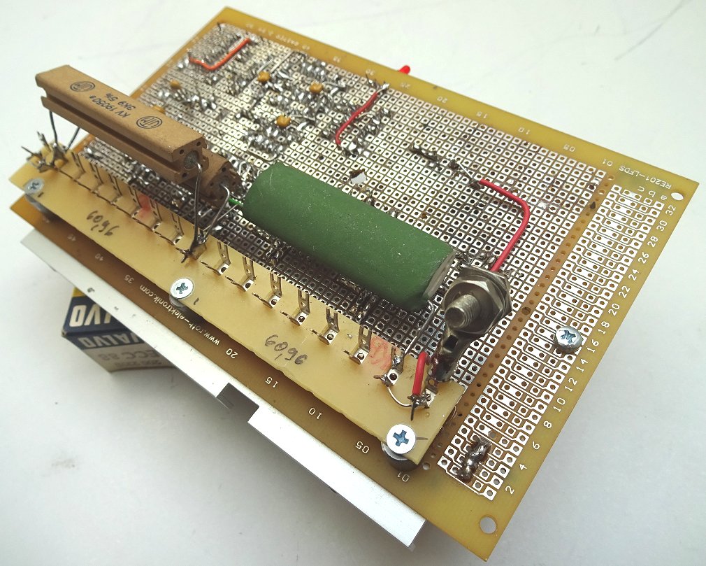 Eigentlich sollte der Dekoder aus der verdoppelten Heizspannung versorgt werden. Wegen des hierbei autretenden starken NF-Brummen habe ich diese Methode verworfen und den Dekoder über belastbare Widerstände (4,15k/12W) direkt an die Anodenspannung angeschlossen. Abhängig vom Betriebszustand des Dekoders schwankt die Spannung am Ende der Widerstandskette erheblich. Daher begrenzt eine Leistungszenerdiode die Betriebsspannung des Dekoders auf einen Wert, mit dem der auf der Vorderseite befindliche Spannungsregler, ohne ihn zu beschädigen, beaufschlagt werden kann.