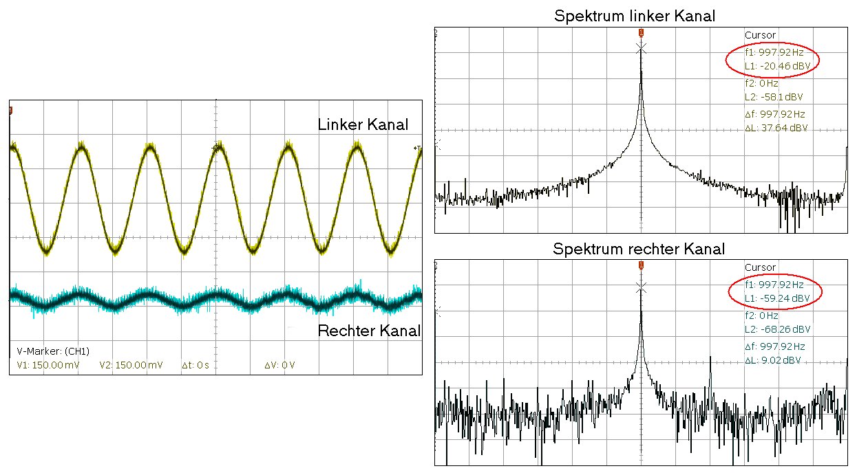 Wird nur ein Kanal, hier ist es der linke Kanal, mit NF versorgt, kann das Kanalübersprechen dargestellt werden. Das linke Oszillogramm läßt Schlimmes befürchten, Klarheit bringen die Spektren der beiden Kanäle: Aus den Amplitudenmesswerten errechnet sich eine Übersprechdämpfung vom linken auf den rechten Kanal von 40dB(39,4dB), ein Wert, der in der analogen Welt als völlig ausreichend angesehen wird. Beinahe derselbe Wert ergibt sich für das Übersprechen im umgekehrten Fall.