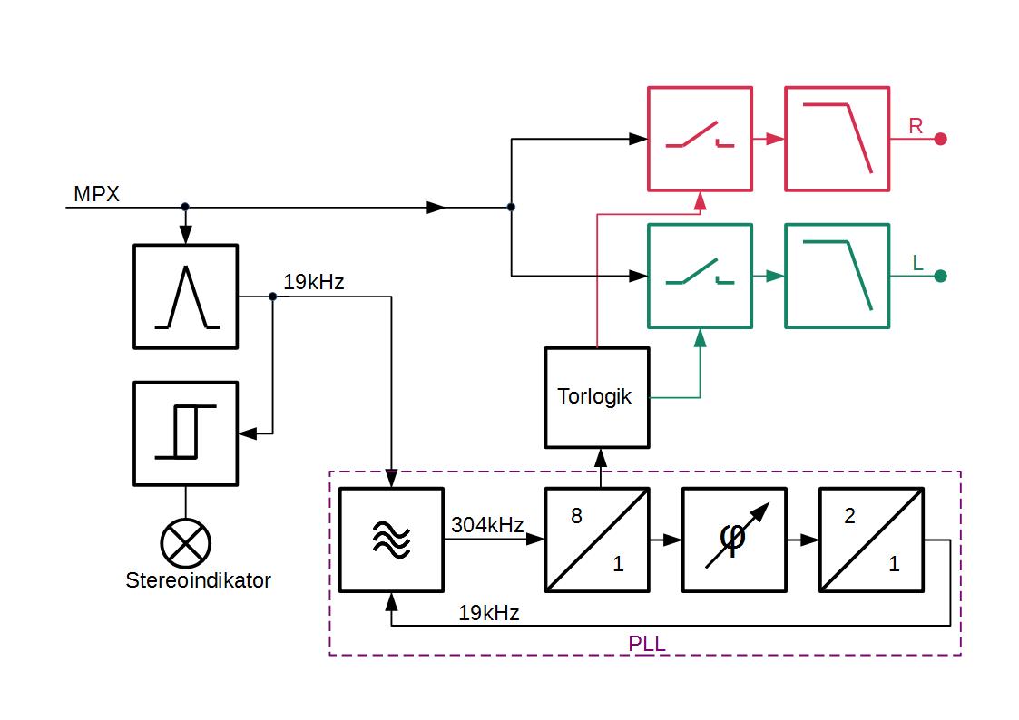Das Blockschaltbild zeigt die Funktionseinheiten des Dekoders und ihre Beziehungen zueinander. Zentraler Baustein des Dekoders ist ein spannungsgesteuerter Oszillator, der auf 304kHz(=16x19kHz) schwingt. Der Oszillator wird innerhalb einer Regelschleife mit dem (LC-gefilterten) Pilotton phasenstarr gekoppelt. Mit Hilfe eines Frequenzteilers, der Bestandteil der Schleife ist, und etwas digitaler Logik werden die Signale für die MPX-Schalter erzeugt. Diese Signale sind nur während eines Viertels der Hilfsträgerfrequenz aktiv, sodass sie mit einer Phasenbrücke (eigentlich eine Halbbrücke), die ebenfalls Schleifenbestandteil ist, auf optimale Kanaltrennung ausgerichtet werden können. Die MPX-Schalter sind der Einfachheit halber im Signalweg angeordnet - sie arbeiten als Gegentaktschalter. Ihnen folgen Tiefpässe mit einer Grenzfrequenz von 10kHz. Ein hysteresebehafteter Schmitt-Trigger wertet die Pilottonamplitude aus und zeigt eine ausreichende Signalstärke an.
