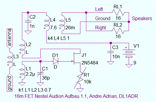 Die Schaltung ist wieder ein "tickler coil" RK-Audion. Die Antenne ist nun induktiv angekoppelt mit 3 Windungen auf dem Ringkern Amidon T94-6. Diese Kopplung bringt am wenigstens Störsignale in den Empfänger. Empfänger-Masse hat nun keine Verbindung mehr zu Antennen-Erde. L1 hat 18 Windungen versilberten Kupferdraht mit 0,6mm Durchmesser. Zwischen Schwingkreis und FET-Gate liegt die Germaniumdiode OA90. Es gibt keinen Arbeitswiderstand und keinen Kondensator - es funktioniert so am besten. Am Source-Anschluss liegt nur der Potentiometer für die Rückkopplungs-Einstellung. Die Rückkopplungs-Spule L2 hat zwei Windungen. Der Kondensator C2 wirkt auch als Klangblende. Mit der Primärinduktivität meines Übertragers ergibt sich ein angenehmer Klang, nicht spitz und nicht dumpf. Die Speisespannung ist 9V für mehr Lautstärke.