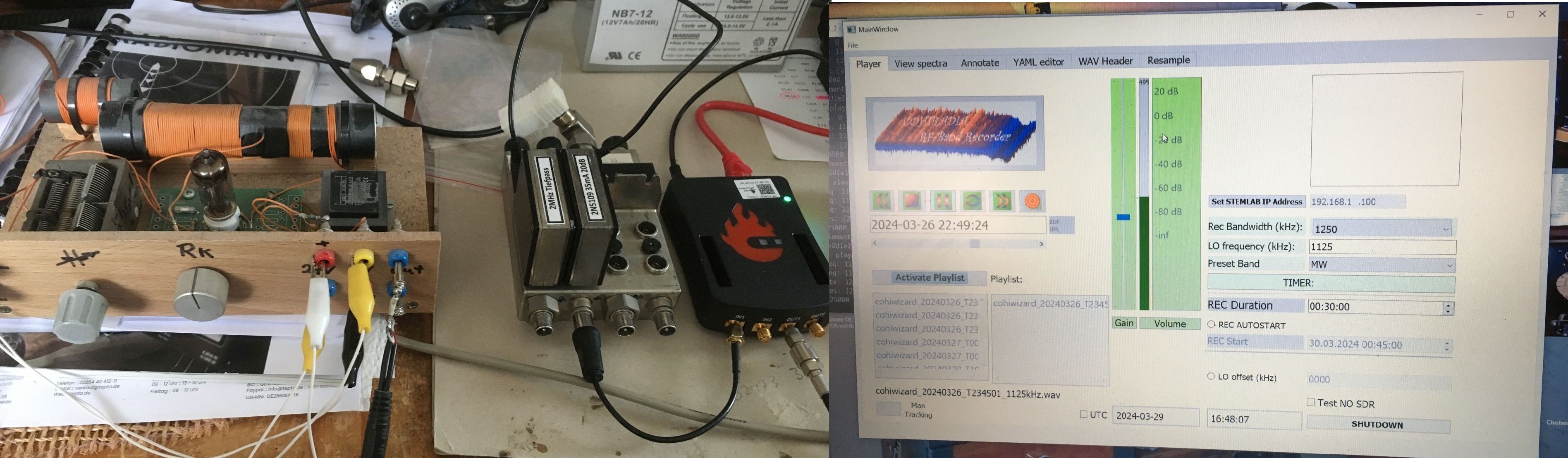 Das Signal meines Dipols wird nachts durch Timer mit einem Red Pitaya SDR (StemLab) in einer Datei aufgenommen. Sinnvollerweise das ganze Mittelwellenband. Durch Abspielen dieser Datei kann ich zeit- und frequenzgenau den Prüflingen identische Verhältnisse bieten. Die Ankopplung wird induktiv durch Annäherung an den Schwingkreis erfolgen. Durch Verstärkereinsatz bei der Aufnahme muss ich sicherstellen, dass der Pegel beim Abspielen exakt die Originalverhältnisse wiederspiegelt.