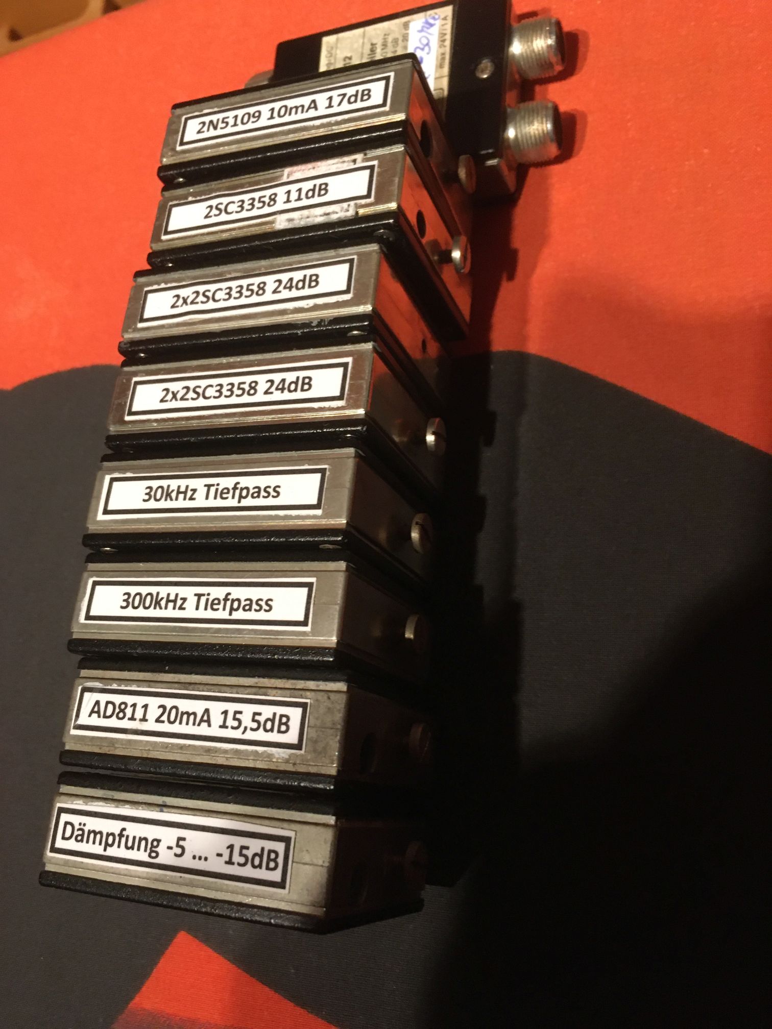 es handelt sich um ausgeweidete Zink-Druckgussgehäuse der Firma Polytron. Das System hiess MKK und stammt aus analogen, kommerziellen Gemein- schafts-Antennenanlagen. Die Module konnten alle möglichen Dinge enthalten. Ich habe sie für meine Zwecke neu bestückt, denn der Red-Pitaya (StemLab) hat im Eingang selbst zuwenig Verstärkung um die volle Dynamik auszunutzen. Der grösste Vorteil ist die Stabilität durch ein hohes Schirmungsmass. Die Software hat noch Beta-Status, und an der Aussteuerungsanzeige muss noch gearbeitet werden.