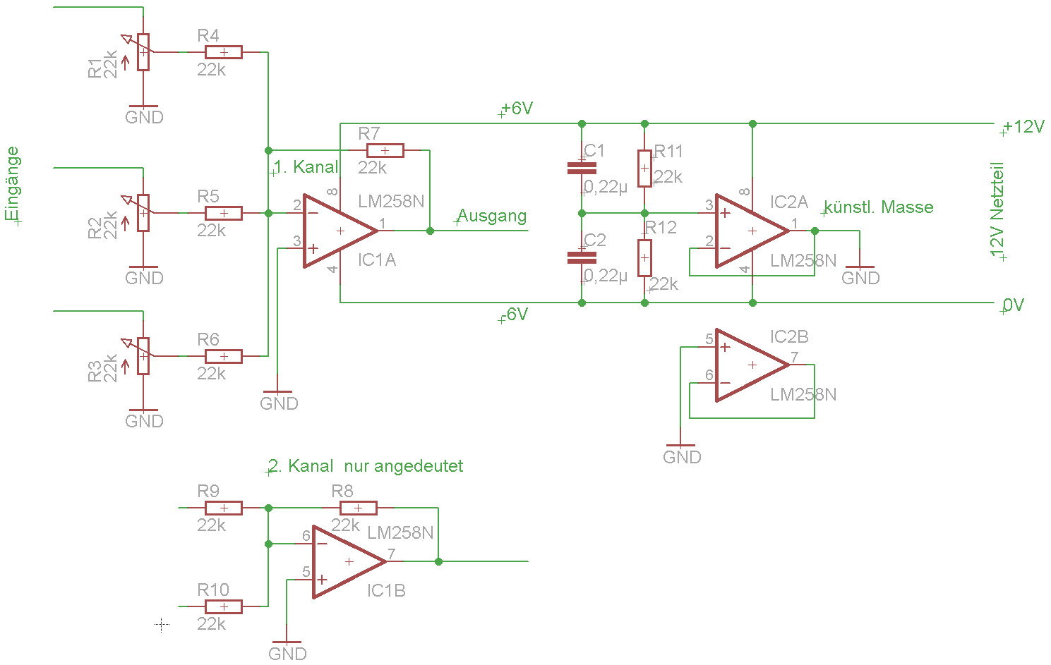 Jetzt verstehe ich das, wie das mit der symmetrischen Stromversorgung gemeint ist. Da ich dafür natürlich noch ein Netzteil bauen müsste, überlege ich, ob die Sache mit den Koppelkondensatoren wie aus der ersten Schaltung nicht einfacher ist. Was für Kapazitäten müssten diese denn haben?