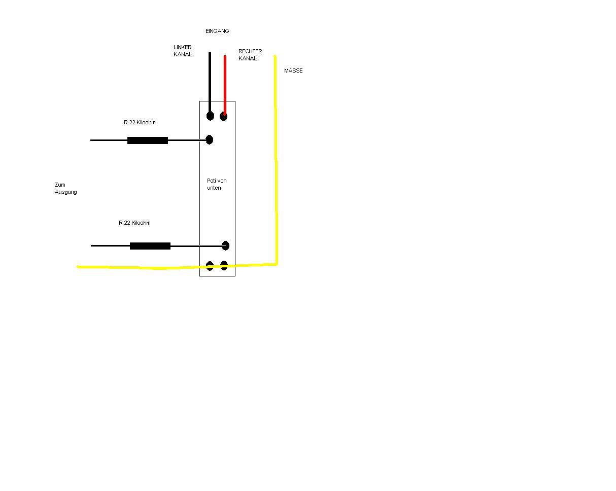 Im Anhang ist ein Bild, wie der Poti von unten aussieht und verdrahtet ist. Zuletzt habe ich nur den Poti mit den Widerständen zwischen CD Player und Aktiv PC Box gehängt, trotzdem kommt kein Ton raus.