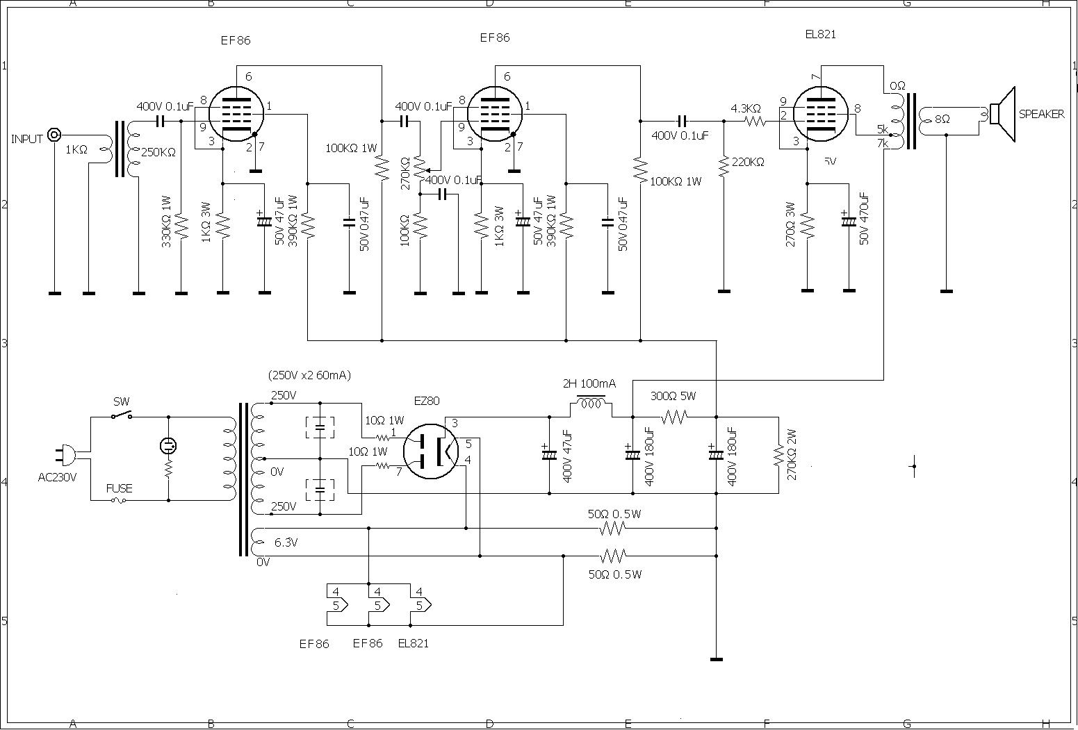 Die EL 821 ist als Triode geschaltet, g2 direkt mit der Anode verbunden. Absicht oder Zeichenfehler? Ger Gitterableit R der EL 821 ist nur max. 220k, das würde eine Verringerung des Anodenwiderstands der Treiber EF 86 bedeuten, aber erst mal probieren. Bei einer zweistufigen Vor-Verstärkung könnte man auch über den Einsatz von NF Leistungsröhren wie EL 84 o.ä. nachdenken. Den Widerstand in der Plusleitung von der Katode der EZ 80 zu den Netzelkos braucht man nicht. Frequenzgangkorrekturen in welcher Form auch immer würde ich erst mal weglassen. Wenn überhaupt, dann erstmal ein regelbarer einfacher R C Tiefpass. Da der Heizkreis einseitig auf Masse liegt, kann man hier nicht symmetrieren. Ich meine, erst mal aufbauen und dann weiter verbessern.