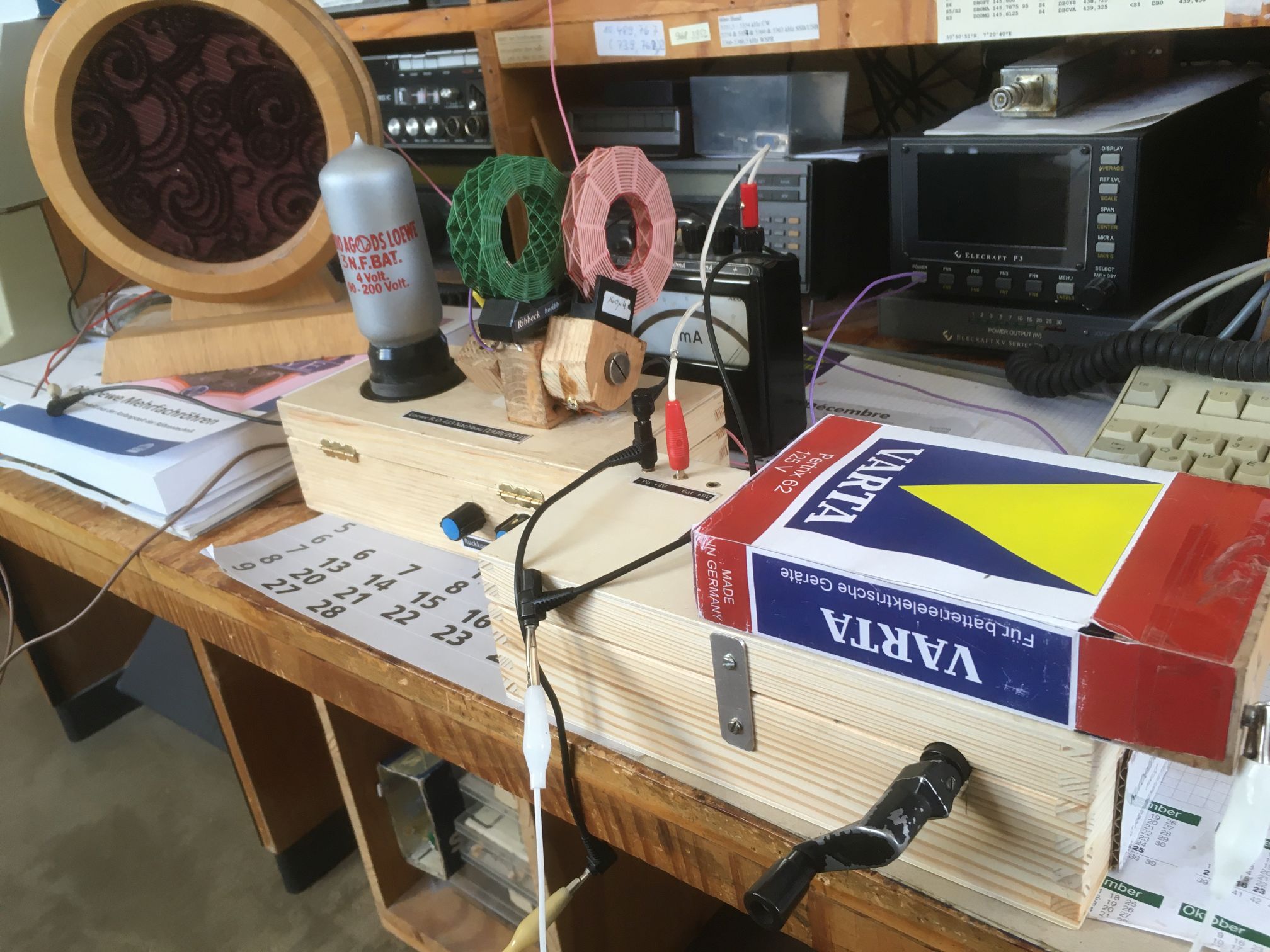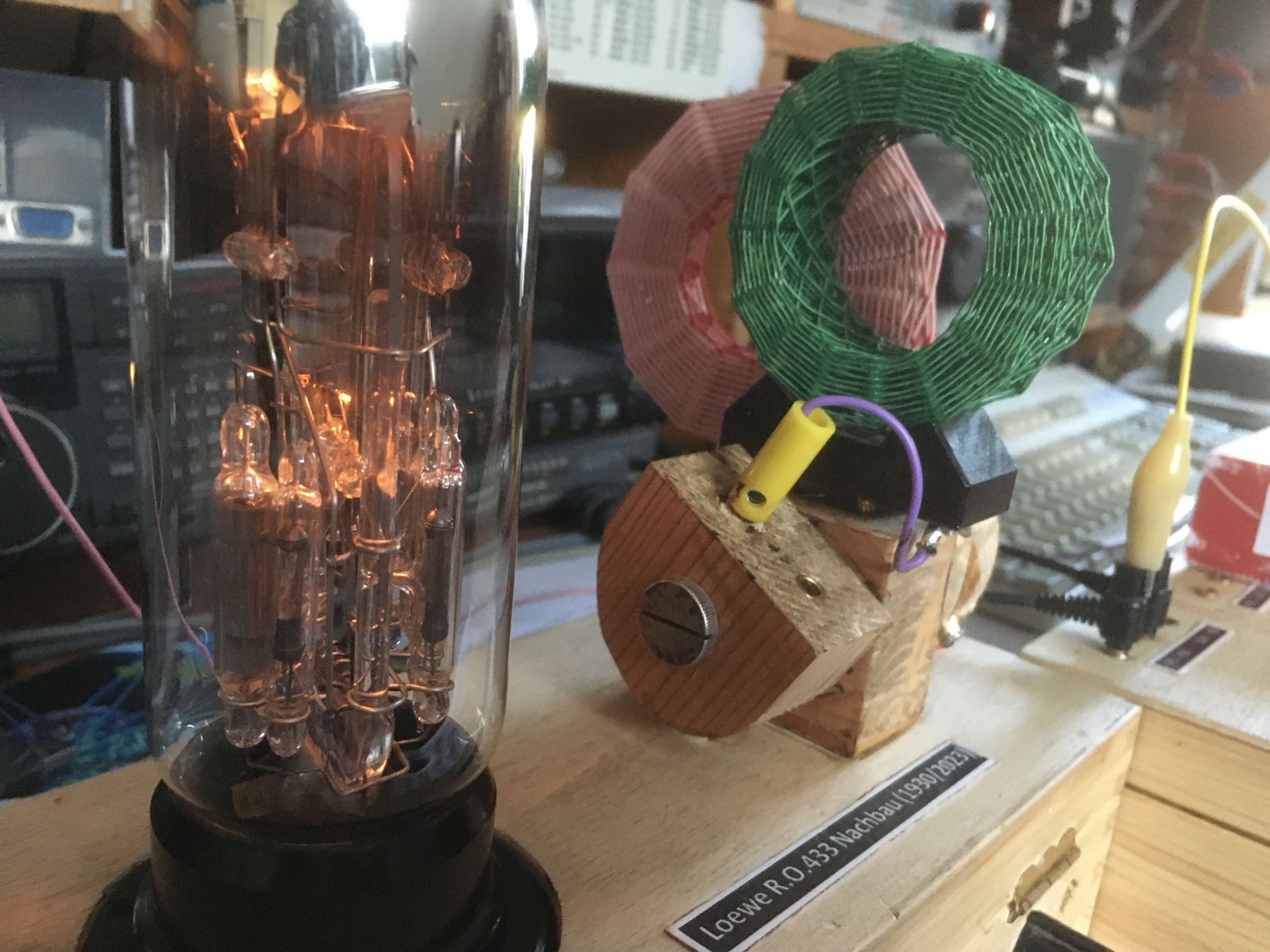 Nachdem ich einen RO433-Nachbau (mit Rückkopplung!) erstellt habe, muss ich meine Äusserung bezüglich des Lautsprecherbetriebs einer 3NF etwas korrigieren. Es reicht ein Ruhestrom von etwa 5 mA bei 100 ... 150V aus, um befriedigenden Lautsprecherbetrieb zu realisieren. Dabei ist ein Emissionswert von etwa 20% ausreichend, wenn man einen 12 kOhm/8 Ohm Transformator (EL95) verwendet und eine lose Kopplung der Antennenspule, wie in den Bildern vorgestellt ist. Der Bodenkontakt wurde mit einer Bodenplatte aus einer HF30 gemacht. Erstaunt war ich, dass eine 3NF-500 keinen Anodenanschluss herausgeführt hatte. Diese Röhre hat eine Restemission von 40%. Ohne Rückkopplung wären 60% sicherlich notwendig. Das ist mit dem örtlichen Modulator simuliert, wäre aber in der Praxis wegen der Abschaltung unserer Mittelwellen irrelevant.