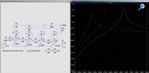 Ja, das Einfachpoti ist ein Kompromiß aber ein vertretbarer und falls Tandem, dann beide Potis mit Vorwiderstand. Der Wert ist nicht kritisch, das kann man sich anpassen, wie man es möchte. Es geht lediglich darum, den Verstellbereich nicht zu groß werden zu lassen. Mit der Frequenzverstellung ändern sich die Verstärkung und die Selektivität etwas. Die Originalschaltung ist hochohmiger ausgelegt, aber da gerade keine passenden Potis zur Hand waren... Habe mich mit der Schaltung zuletzt vor ein paar Jahren beschäftigt und darum zur Erinnerung heute mal die Sim. angeworfen. In dem Beispiel kann man die Unterschiede sehen, rechts mit Tandempoti (R17, R18), links mit einfachem (R7). Die Differenz ist nicht wirklich dramatisch. Es lohnt sich vielleicht im Voraus etwas zu experimentieren und sich die Schaltung nach den eigenen Bedürfnissen anzupassen.