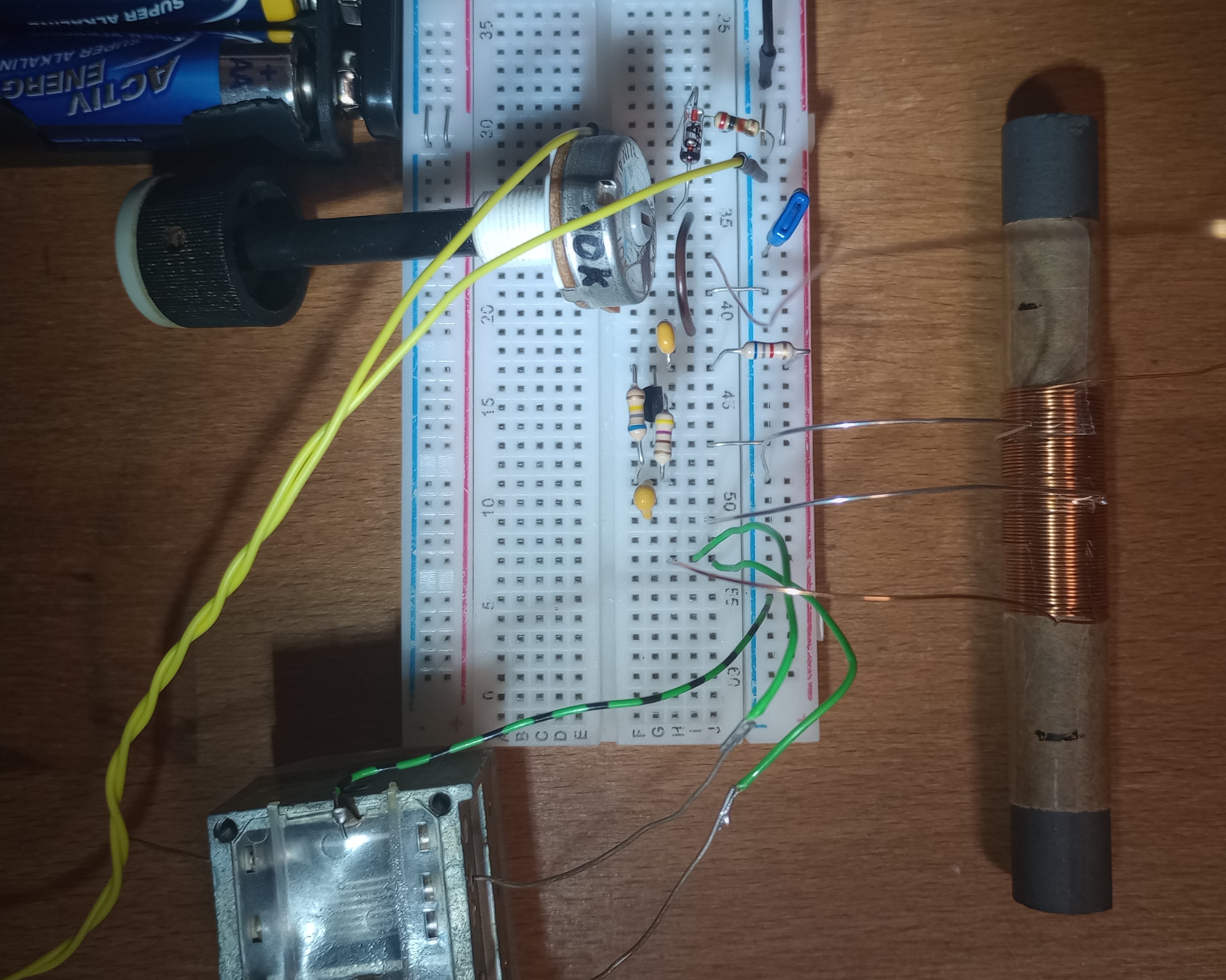 Die größte Änderung ist in der Lage von R1. In der Original-Schaltung liegt R1 zwischen Potentiometer-Schleifer und RK-Spule. In der Simulation der Original-Schaltung hat der Transistor-Basisstrom parasitäre Oszillation. Diese verhindert R1 als Schwingbremse direkt an der Basis in der Simulation. An der Diode habe ich einen Piezo-Ohrhörer angeschlossen.