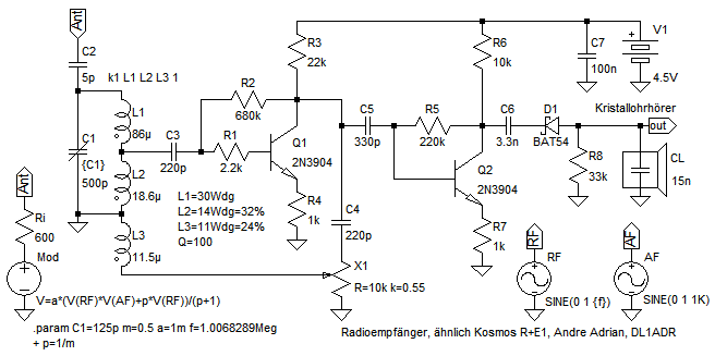 Die Schaltung wurde in LTSpice gezeichnet und enthält alles nötige um einen Rückkopplungsempfänger zu simulieren. Die Formel beim Bauteil Mod erzeugt eine Amplitudenmodulation mit den Parametern Trägerfrequenz f, Modulationsgrad m und Pegel a. Die Simulation der RK-Schaltung erfolgt in mehreren Schritten. Zuerst wird ohne AM-Sender der Empfänger auf schwache Oszillation eingestellt, zum Beispiel durch C1=125pF, a=0 und k=0.6 bei Potentiometer X1. Dann wird die in der Simulation gemessene Empfänger-Frequenz als f für den Modulator eingetragen und a auf 1mV mit a=1m gesetzt. Im letzten Schritt wird die Rückkopplung reduziert auf im Beispiel k=0.55 bei Bauteil X1 um guten Rückkopplungsempfang zu erhalten.