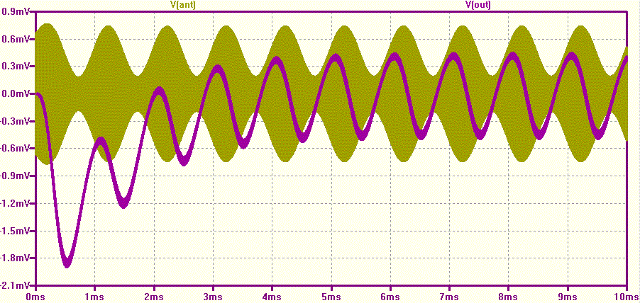 Als Simulationsergebniss wird Spannung am Eingang V(Ant) und am Ausgang V(out) angezeigt. Die "Kunstantenne" hat Innenwiderstand 600 Ohm. Deshalb sind am Antenneneingang weniger als 1mV Spitzenspannung. Laut Simulation ist die Ausgangsspannung 0.8mV Spitze-Spitze.