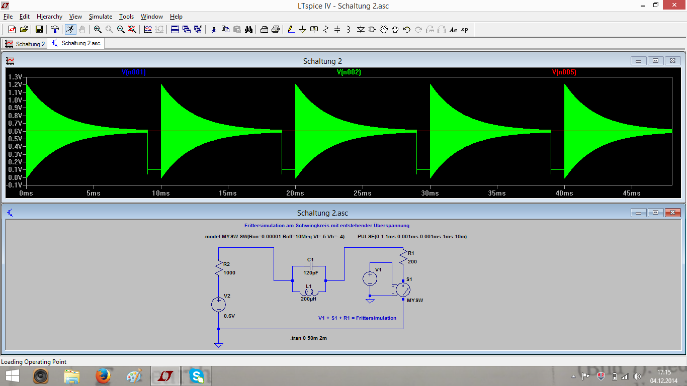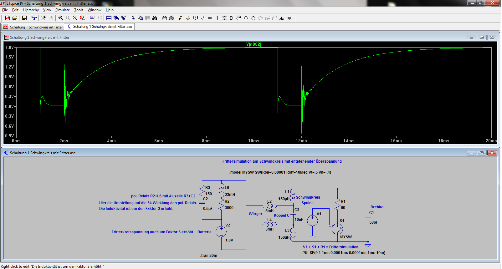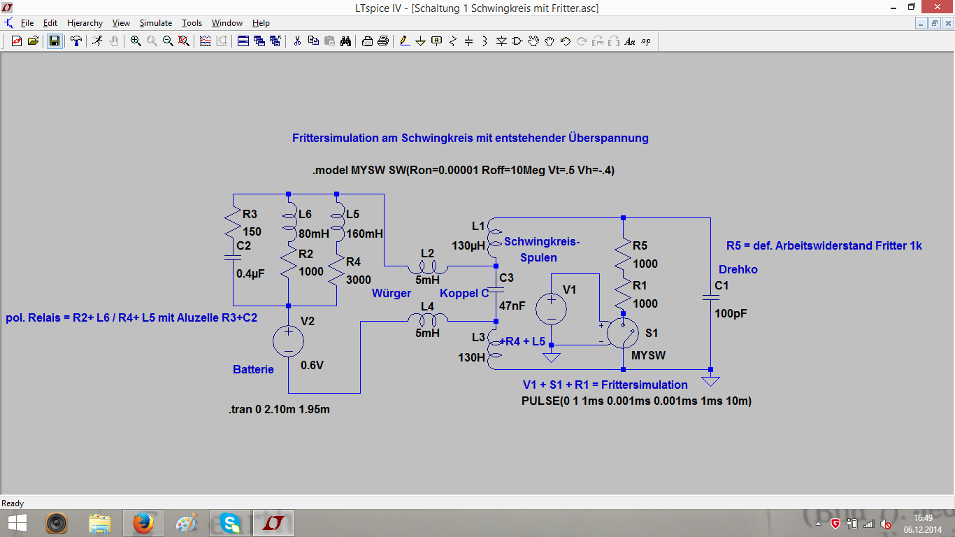 Hier eine Schaltungssimulation ohne Drosseln und Relaisinduktivitäten. Die Überspannung wird also wirklich, wie ich viel weiter oben schon berichtete, direkt im Schwingkreis generiert. Um das Beispiel gut zu simulieren... habe ich meine erste Schaltungsweise gewählt. Die entstehende Überspannung ist schon gewaltig im Bereich von nur 0.6V Fritterkreisspannung. Diesen Versuch habe ich auch am unangeschlossenen Rahmenschwingkreis praktisch nachvollzogen. Also nur Schwingkreis mit Vorwiderstand! Die Überspannung ist abhangig von der Höhe des möglichen Induktionsstromes bedingt durch Widerstand Fritter bei HF xx und Relaiswiderstand xx !!!