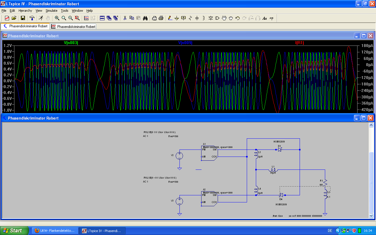 Ich habe mit Spice festgestellt, dass bei meinem ersten Model, sich alle Spannungen im Kreis synchronisieren sowie ein Kondensator eingesetzt wird. Die 180 Grad der entgegengesetzten Teilspannungen und auch der 90 Grad Phasenversatz waren dahin. Deswegen habe ich dann einen Trick angewendet und ein stabileres Model entwickelt, und einmal die R.W. Schaltung und einen Phasendiskriminator aufgebaut. Das Problem des Phasenversatzes konnte ich mit einem sin/cos- Generator umsetzen und konnte damit die Schaltung stabilisieren, da die Transformationen des Eingangsbaluns wegfallen. Die Ergebnisse zu interpretieren ist bei Spice nicht einfach,... ich meine die Frequenzdemodulation sichtbar zu machen. Die Ergebnisse der Messungen an den Teilinduktivitäten Drossel usw. fallen bei den Schaltungen ziemlich ähnlich aus....die Bewertung über den Winkel konnte ich noch nicht umsetzen, geschweige denn eine NF-Frequenz rauszaubern...