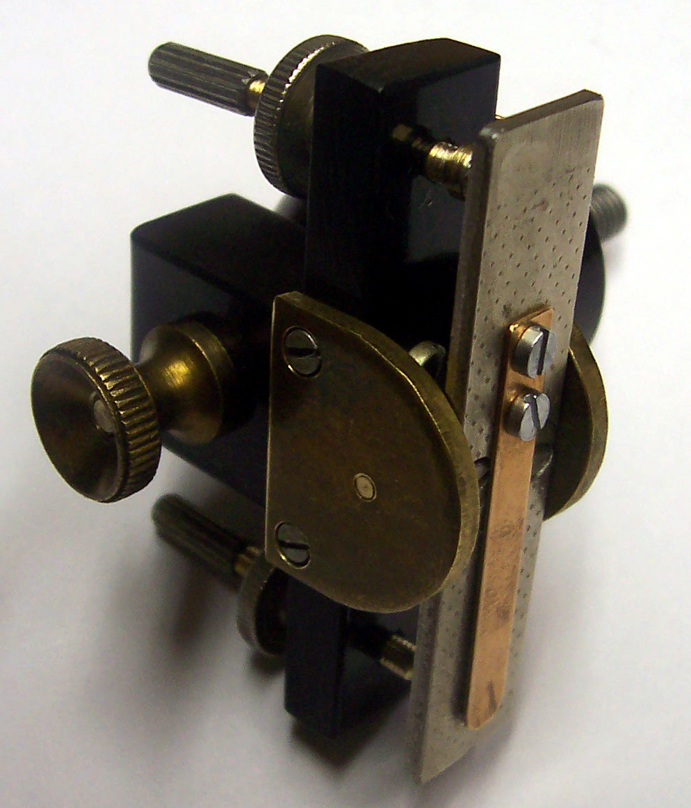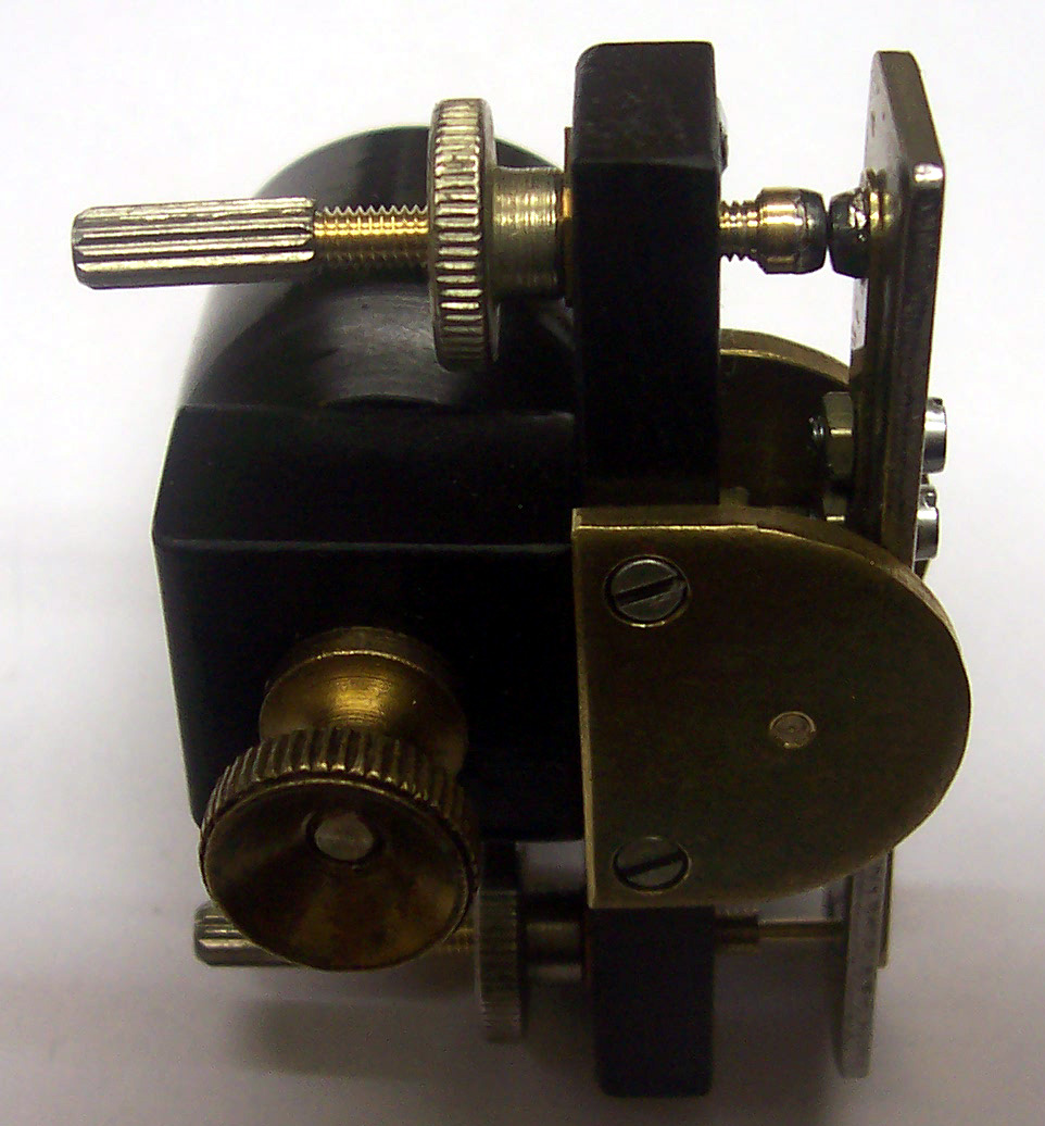 Bei meinem Depreze ist das schwarze Bakelit die Halterung. Das silberne Blech ist ein Stück Weicheisen, welches den in der Mitte gelagerten Anker bildet. Auf dem Anker ist ein Kontakt, dessen Gegenkontakt mit der einen horizontalen Rändelschraube verstellt wird. Die andere horizontale Röndelschraube drückt durch ein Loch im Anker auf eine Blattfeder, womit die Kontaktöffnungskraft eingestellt wird. Die obere Rändelschraube dient zum Verdrehen der Konstruktion , um so den Abstand Anker/Induktorkern einzustellen. Alles geschieht im zentel-mm-Bereich - den Anker sieht man nicht mehr schwingen.