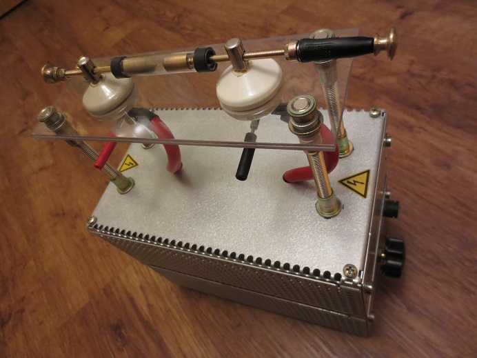 ich habe wieder meinen Klimperkasten umgebaut. Ich hatte erneut einen Überschlag im Gerät und der nächste 555 war breit. Ich habe den Überschlag zum Glück gesehen...er war im Porzellan- Isolator. Ich habe dann das Blech mit zur Arbeit genommen und mit 30KVAC in unserem HV- Raum getestet. Bei 12 KV kamen die Überschläge. D.h ab 4-5mm Funkenstrecke wird es für meine Isolatoren gefährlich. Das Witzige ist, dass ich ohne die Löschfunkenstrecke keine DVBT- Störungen mehr habe....nur äußerst gering und nur bei hoher Leistung. Ich habe nun den oberen Kasten entfernt und auf dem neuen Deckel der zweiten Etage (Zündspule) eine neue einfache Funkenstrecke im Glasröhrchen mit spitzen Elektroden gesetzt. Der 10mm Horst- Fritter wurde abgedreht und die Isolatoren im Makrolon bilden auf 4 Füßen die Basis. Die 25KV Hochspannungsleitungen werden direkt angeschraubt. Die ersten Tests waren sehr zufriedenstellend und nun kann man auch etwas sehen. An der Glimmlampe, die mir die HV vorn am Gerät anzeigt, ist jetzt die induktive Einkopplung zur Zündspule entfernt. Die Anzeige wird nun primärseitig an + und am potential getrennten Gehäuse der Spule abgegriffen. Sicher ist sicher, da bei hohen Spannungen auch hier durchaus ein Überschlag gegen das Gehäuse möglich ist. Die Glimmlampe zeigt nun eigentlich die Überspannungen an der Primärseite der Zündspule an.