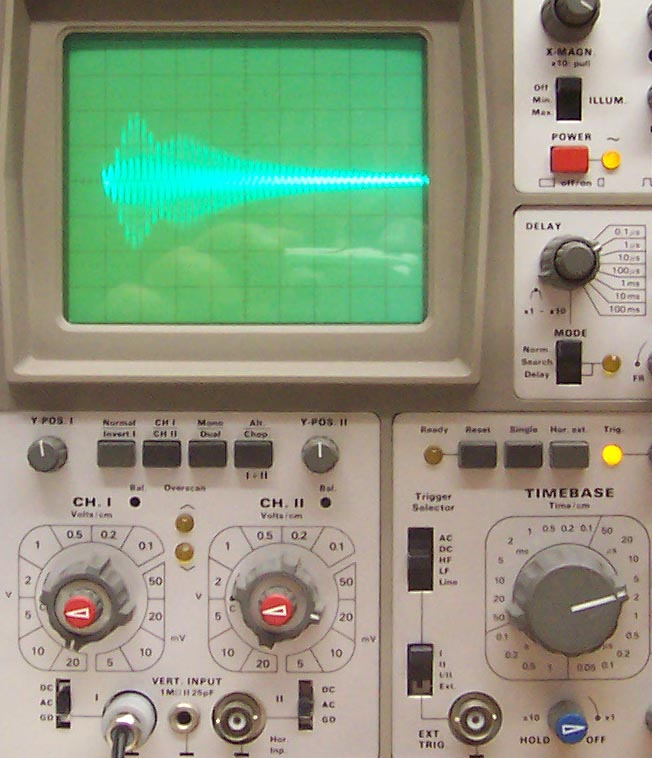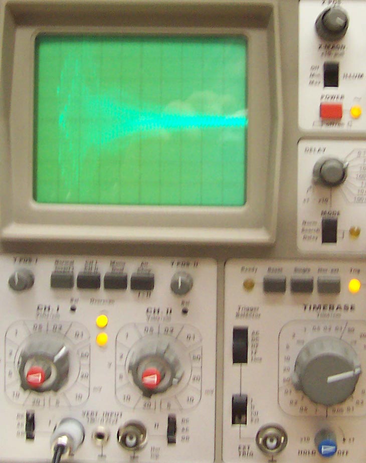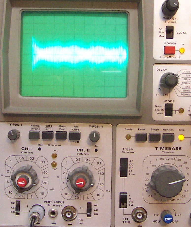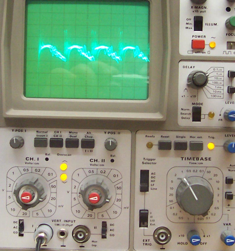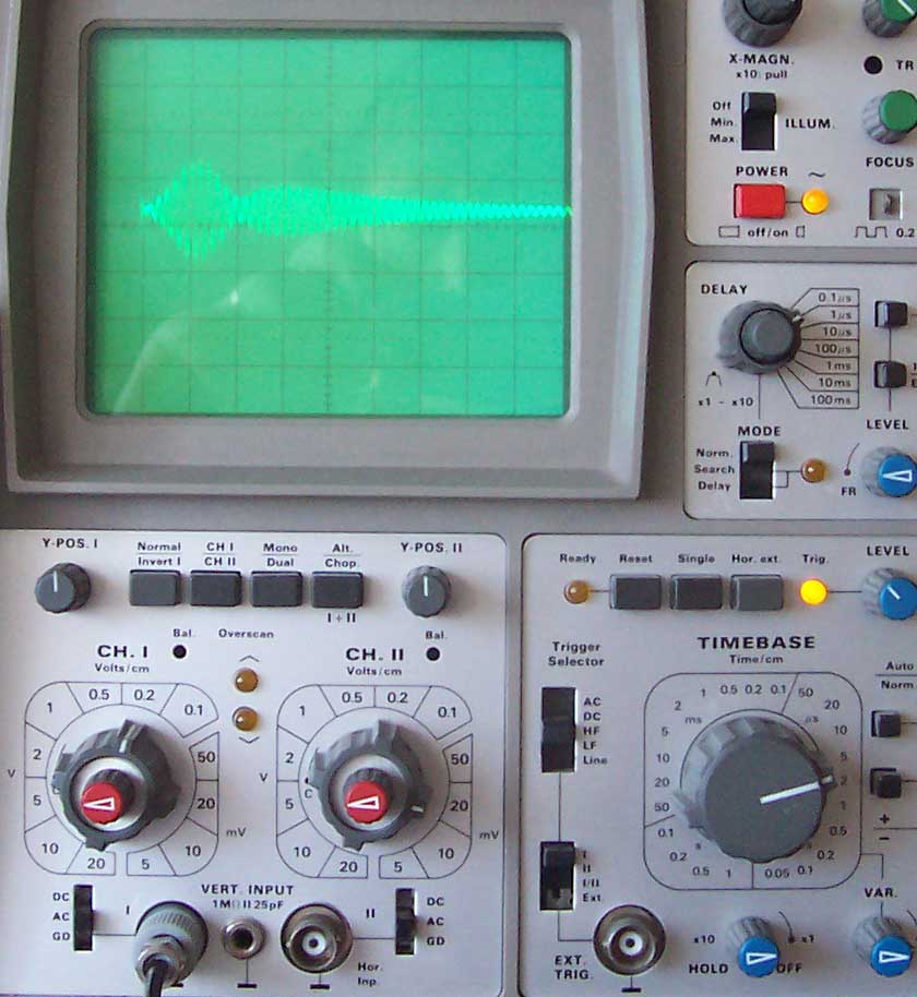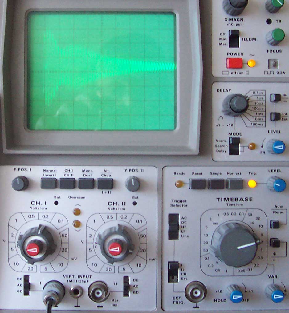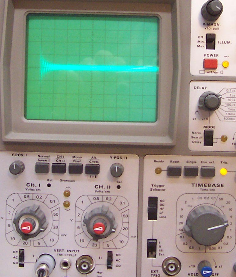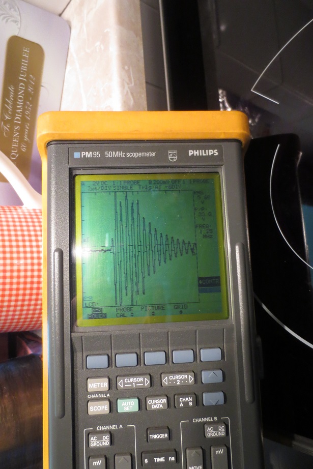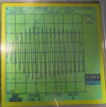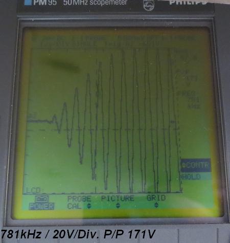 Die Ausbeulungen in der gedämpften Welle rühren aus der Rückwirkung des Sekundärkreises auf die Primärinduktivität. Ich hatte da mit meinen älteren Aufbauten schon ganz skurile Oszillogramme.....im jetzigen Stand sehen die ziemlich gleichmäßig aus. Ist wenig C im Kreis steigt der Wellenzug sehr steil an, ist mehr C im Kreis hat man den langsameren Anstieg zum Maxima. Alles natürlich auch in Abhängigkeit zur eingelegten Induktivität. Eigentlich sieht Bild "Empfangssignal mit Erde 14...16Vss" nach wenig C und höherer Frequenz aus. Hier ein altes Bild aus meinem Fundus mit 1.25MHz und dahinter eine extrem schöne ged. Welle. bei 781kHz. Diese schwankenen Signale sind mit einem Digitaloszilloskop natürlich viel einfacher zu erfassen.