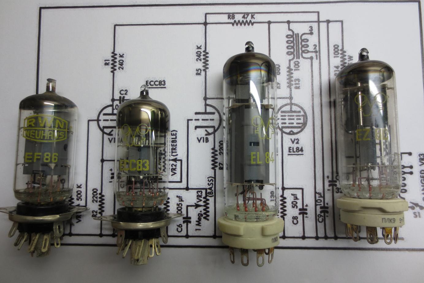eure Bestätigung hilft ungemein. Der erste Aufbau wird die naheliegendste Version sein. ECC83 als Doppeltriode für die Eingangstufen und dann gleich die EL84 als Endstufe. Wenn es nicht ausreicht, wird die EF86 noch davor geschaltet. Alle abgebildeten Röhren habe ich geschenkt bekommen. Ich hoffe ihr habt alle solch liebe Radiofreunde. Den Plan im Hintergrund werde ich noch anpassen (abspecken der Klangregelung und Lautstärkeregler vor 2. Stufe).