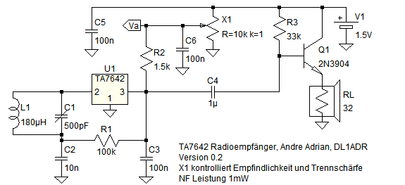 Zweiter Nachtrag: Q1 ist nun wegen höherem Eingangswiderstand in Kollektorschaltung. R3 hat einen Wert der 1mW NF Leistung am Ohrhörer erlaubt. C4 hat 1uF für bessere Basswiedergabe. Die TA7642 Versorgungsspannung am Punkt Va ist 631mV bei größter Trennschärfe. Die gemessene Stromaufnahme der gesamten Schaltung ist 3,3mA.
