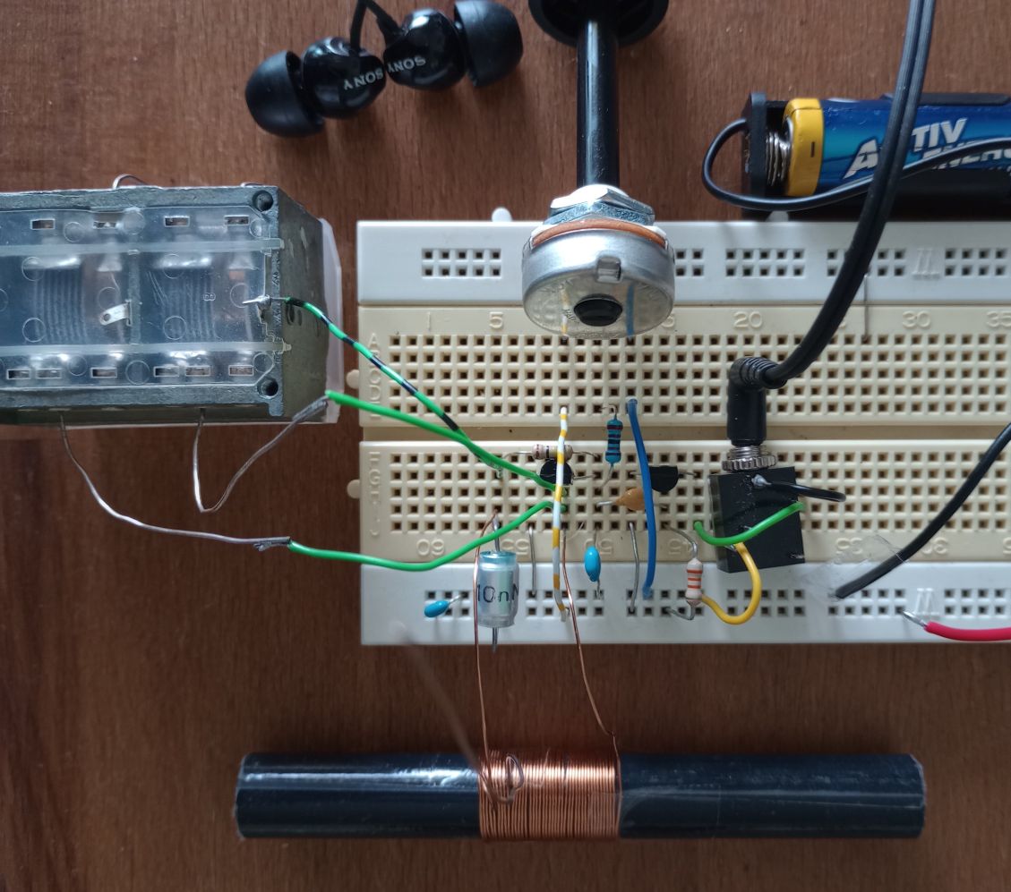 Diese Schaltung ist hochohmiger ausgelegt als die Kosmos R+E1 Schaltung. Deshalb ist die Versorgungsspannung mit 9V auch höher. Weiterhin wurden soweit möglich die gleichen Bauteilewerte benutzt. Die HF-Koppelkondensatoren haben alle 47pF. Zum Vergleich: Im AM-Empfänger IC TA7642 haben die HF-Koppelkondensatoren 12pF. Die Arbeitspunkteinstellung erfolgt bei Q1 und Q2 jeweils über drei Widerstände. Dabei erhöht der Emitterwiderstand den Eingangswiderstand der Stufe und reduziert die Verstärkung. Der Widerstand zwischen Basis und Kollektor bestimmt hauptsächlich den Arbeitspunkt, d.h. den Kollektorstrom. Nebenbei sorgt er für eine Gegenkopplung und reduziert den Klirrfaktor. Der Kollektorwiderstand wandelt die Kollektorstromänderung in eine Kollektorspannungsänderung um. Q3 arbeitet in Kollektorschaltung. Die Demodulationswirkung von Q3 kann ich nicht in LTSpice simulieren, aber die Schaltung funktioniert im Aufbau, natürlich wieder auf einem Steckbrett. Der Kopfhörer hat zweimal 2000 Ohm Widerstand.
