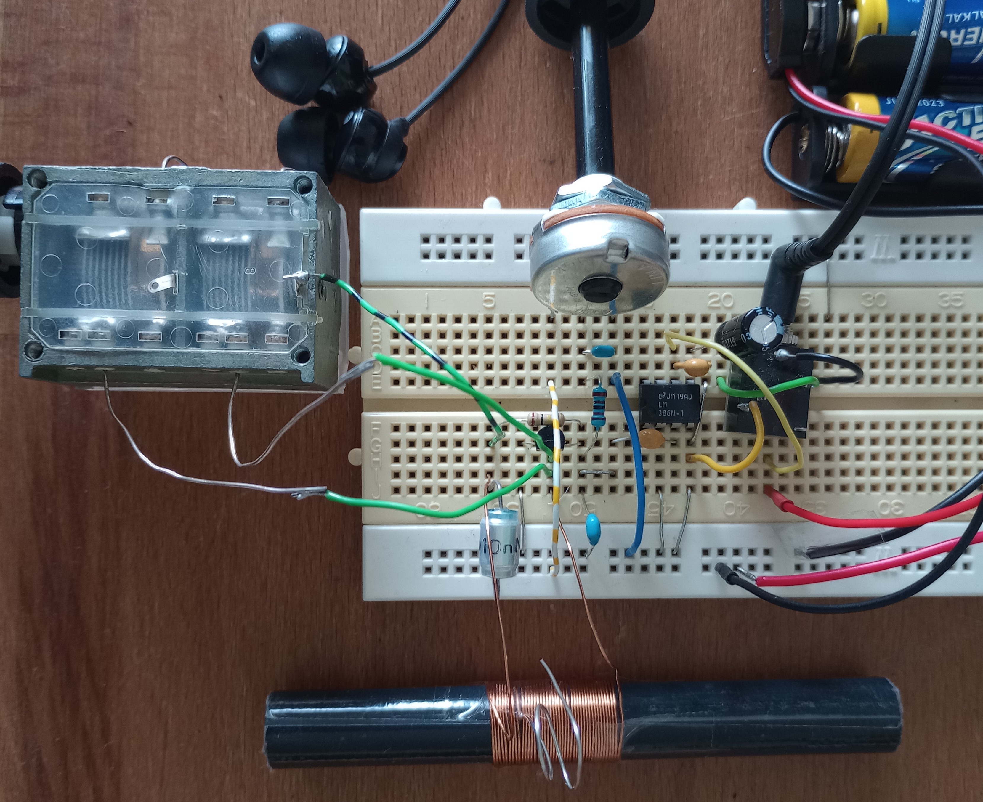 Nachtrag: Ein Kondensator von 10uF zwischen Pin 1 und Pin 8 des LM386 steigert die Spannungsverstärkung von 20 (26dB) auf 200 (46dB). Leider steigt auch der "Rauschteppich" (noise floor) dadurch. Mit dem 10uF Kondensator kann ein Lautsprecher mit dem Radio benutzt werden. Es wird nicht "Zimmerlautstärke" erreicht, aber für eine ruhige Umgebung genügt es.