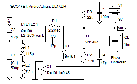 Der Thread "Radiomann AC122 Nestel-Audion" ist ein "Transistor RK-Radioempfänger simulieren und bauen" Thread geworden. In der Zwischenzeit sind 12J1L (russischer RV12P2000 Nachbau) Pentoden eingetroffen. Weil ein FET fast so wie eine Pentode funktioniert, habe ich ein "ECO" FET Audion simuliert und aufgebaut.
