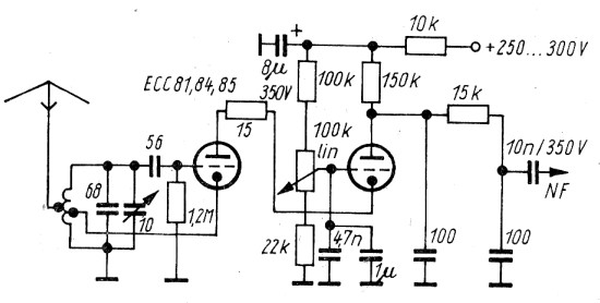 Manchmal findet man an Punkt B - R2 auch eine Reihenschaltung von einer HF Drossel und einem kleineren Anodenwiderstand. So ist die Anodenspannung höher und damit auch die Arbeitssteilheit der Röhre. Bei Trioden bestimmt noch wichtiger als bei Pentoden. Die Kombi R1 und 330pF ist bestimmt experimentell optimiert worden, der niedrige Gitterableitwiderstand des Audion verringert die Verzerrungen, bei einer 30m Antenne bestimmt nicht verkehrt da können schell Übersteuerungen auftreten. Bei geringeren Antennenspannungen könnte dieser R größer sein. Interessant ist die Rückkopplung über die Katode, damit ist die von Rainer angesprochene Feinreglung über ein eine Poti in der Anodenzuführung genau richtig.