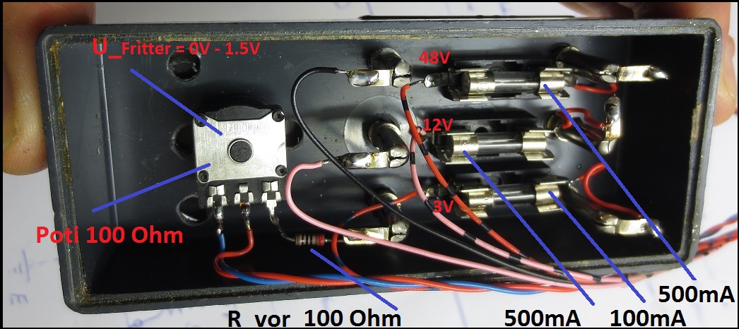 1. Die Fritterkreisspannung habe ich ja dem Verteiler links zugeordnet. Dies hat den Grund, da hier nur sehr selten nachgestellt werden muss. ZB. ...wenn die Batteriespanung sinkt. Die Grundstellung des Poti zeigt 0.7V bei 3V Batteriespannung. Links von der Mittelmarkierung < 0.7V / rechts > 0.7V.