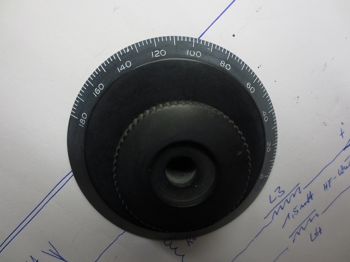 3. Hinter dem Skalenkopf des Variometers war eine Halterung zur Stabilisierung der Achse montiert. Diese Halterung werde ich wieder anschrauben und daran eine Skalenscheibe aus einer halbierten CD anbringen und ersteinmal eine graphisch anspruchsvolle Handbeschriftung auf Papier vorsehen. Auch eine Blockierung der Achse bei 180 Grad- Drehung soll dort angebracht werden.
