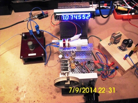 Dann habe ich mit verschiedenen Spulen herumexperimentiert und habe festgestellt das sich das Pendelaudion auch bestens für Kurzwelle eignet. Bis hinunter in das 80m-Band habe ich sehr gute Ergebnisse erhalten. Da das Audion quasi mit angezogener Rückkopplung arbeitet habe ich noch eine Frequenzanzeige , allerdings als separaten Teil dazugebaut.