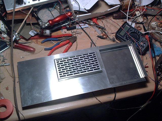 so ist es .. noch unlackiert aber fast fertig. Aluminiumblech, 1,5mm Wenn der Holzdeckel zu ist sieht man davon nurnoch den Grill von der kleinen Kühl-Haube Die tiefergelegte Seite, rechts, für Knöpfe die nur bei offenem Deckel zugänglich sind. Das wird wieder, so wie die Front, graphitschwarz-einbrennlackiert. Bastelradio-Design.