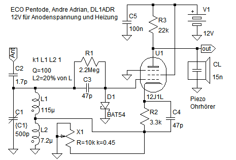 Ein optischer Nachteil der 12J1L ist die Aluminiumdose. Dadurch ist der Glaskörper der Röhre gut geschützt und abgeschirmt. Die "Blechdose" läßt sich leicht entfernen. Zwischen Drehkondensator und Potentiometer ist der Piezo-Ohrhörer sichtbar. Die Lautstärke finde ich für ein 12V Röhrenaudion sehr gut. Ohne Messung bin ich der Meinung, daß 12J1L Audion ohne Diode D1 ist nur wenig leiser als das FET Audion mit Diode D1.