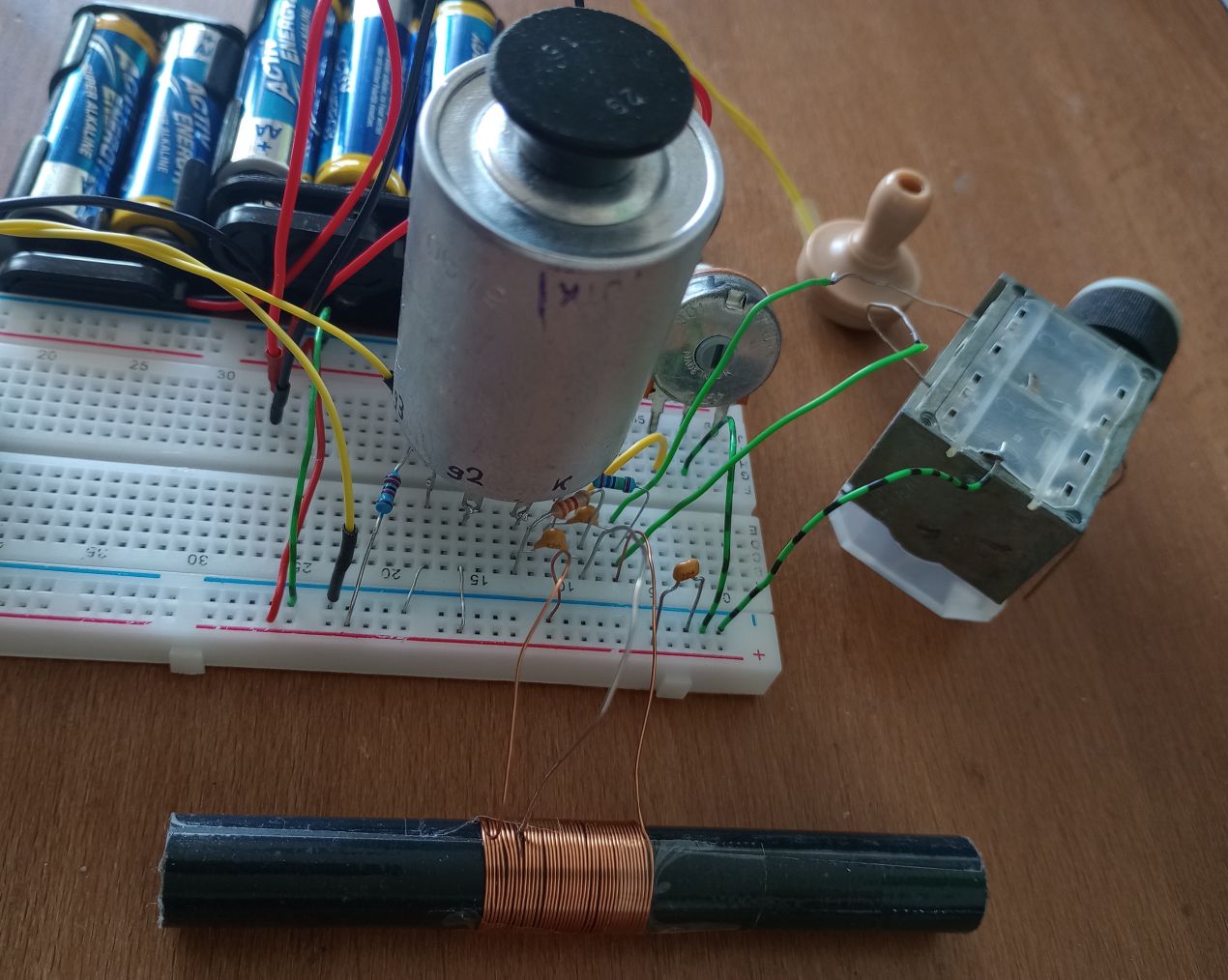 Nachtrag: Bei der Optimierung des Aufbaus sind einige Bauteilewerte geändert worden. C3 und C4 sind nun 1nF. Dadurch ist die Oszillatoramplitude weniger von der Frequenz abhängig. In Bandmitte wird nun etwas weniger RK benötigt, an Bandanfang und Bandende etwas mehr. Vorher wurde bei 530kHz deutlich mehr RK benötigt als bei 1620kHz. Das L zu C Verhältnis ist bei höheren Frequenzen besser. R3 wurde auf 3,3 Kiloohm erhöht. Falls das Audion beim Nachbau nicht funktioniert ist R3 auf kleinere Werte wie 2,2 Kiloohm oder 1 Kiloohm zu reduzieren. Mit kleineren Werten von R3 steigt die Empfindlichkeit des Audion, gleichzeitig sinkt die Trennschärfe, weil der Schwingkreis mehr belastet wird.