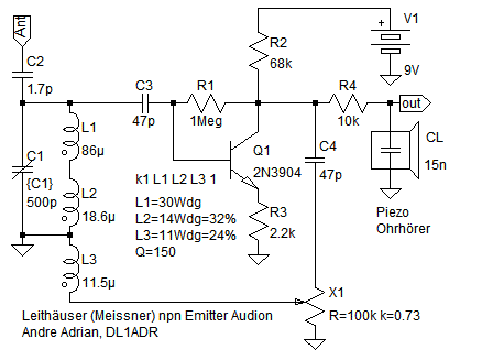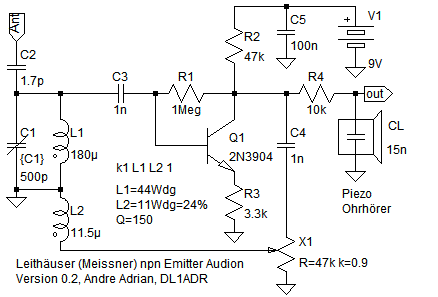 Endlich funktioniert in Simulation und Aufbau ein Bipolar Transistor Audion. Die Schaltung ist ein Leithäuser (Meissner) Audion. Der Eingangswiderstand des npn Transistor in Emitterschaltung wird durch Emitterwiderstand R3 erhöht. Deshalb ist es nicht nötig die Basis des Transistor an eine Anzapfung der Schwingkreisspule zu legen. Die Schaltung ist hochohmig ausgelegt - der Kollektorstrom ist ungefähr 100uA. Widerstand R4 verhindert, daß die Kapazität des Piezo Ohrhörer die Hochfrequenz am Kollektor von Q1 kurzschließt.