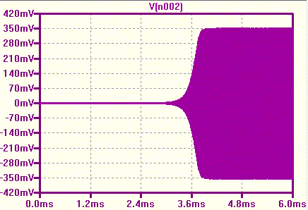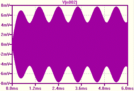 Der zweite Simulationslauf zeigt wieder am linken Ende von C3 eine AM modulierte Schwingung. Der AM Modulator liefert in der Simulation 1mV Spitze an Anschluß Ant. Durch die Rückkopplung wird das Signal auf fast 8mV Spitze erhöht. Im Aufbau messe ich nicht an dieser hochohmigen Stellung, sondern am niederohmigen Emitter mit einer x10 Oszilloskop-Spitze.