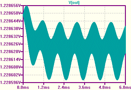 Im dritten Diagramm wird Spannung am Abschluß out in der Simulation gezeigt. Das NF Signal ist nur 30uV Spitze-Spitze. Aber es ist die Simulation der Demodulation eines Transistor Audions.